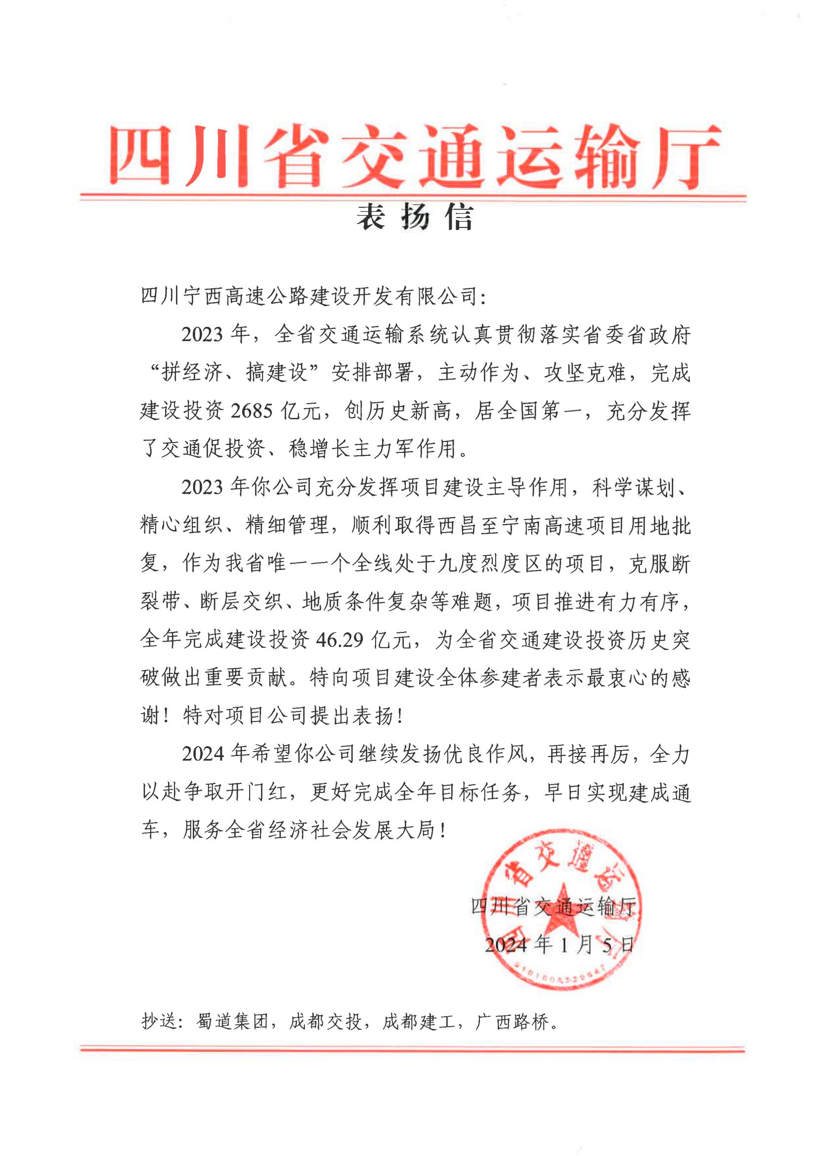 1月5日,四川省交通运输厅发来一封表扬信,对西宁公司提出表扬,向项目全体参建人员表示慰问和感谢。