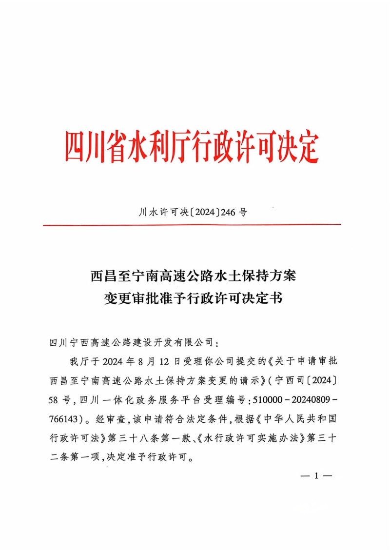9月30日,西昌至宁南高速公路项目水土保持方案(重大变更)报告书成功获得省水利厅的批准,前置要件全面完成。