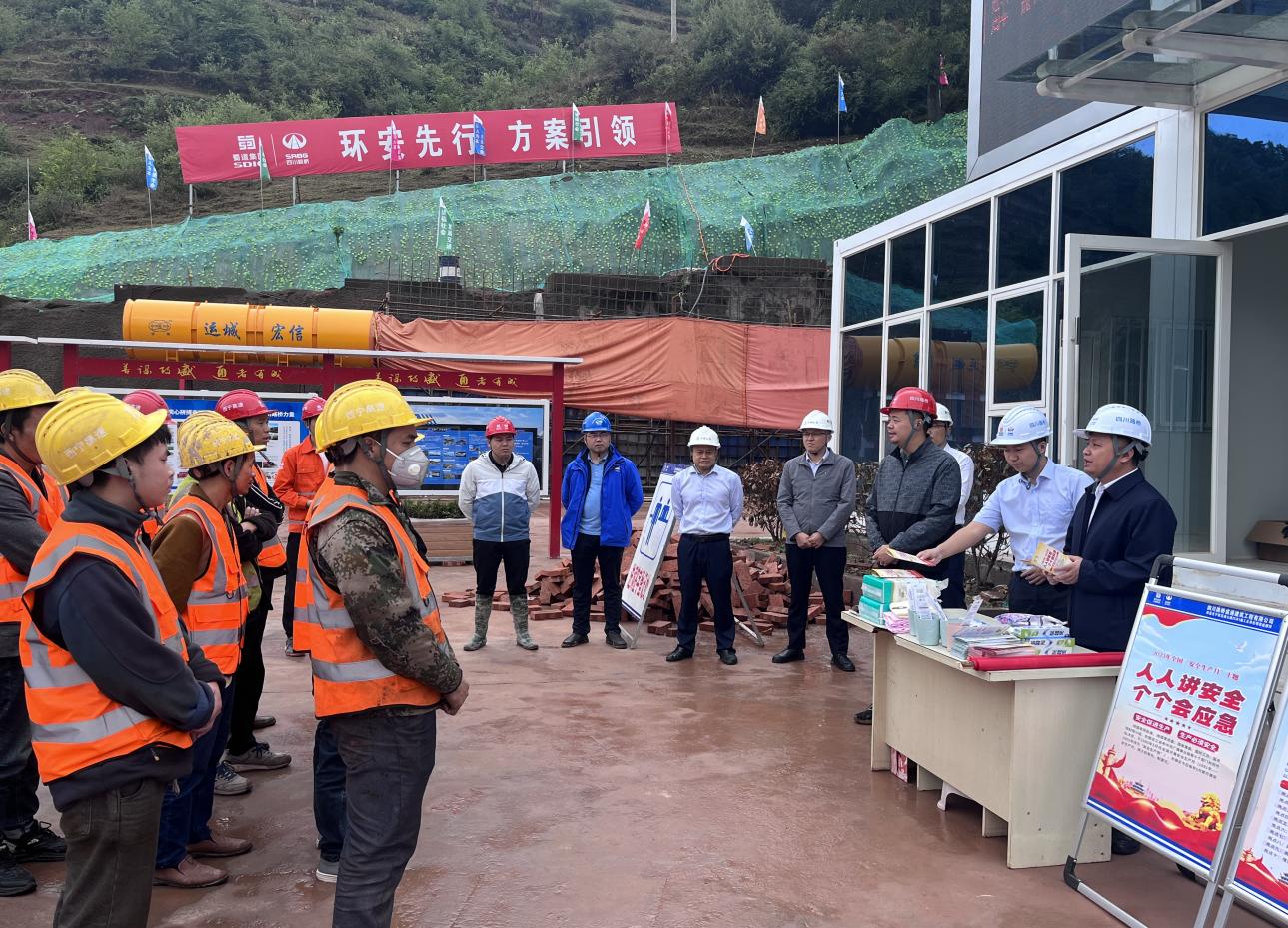 为切实树牢安全发展理念,增强安全防范意识,推动安全生产工作向纵深发展 , 6月15日上午,宁西公司联合西宁高速TJ2/TJ3项目部在大箐隧道出口开展以“人人讲安全 个个会应急”为主题的安全宣传咨询日活动 ,宁西公司副总经理张闻捷、曹然,安全环保部、工程管理部、普格代表处及监理单位、施工单位有关负责同志和一线作业人员共计60余人参加。